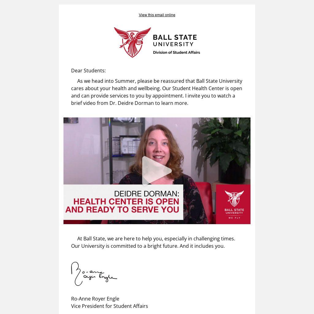 As we head into Summer, please be reassured that Ball State University cares about your health and wellbeing. Our Student Health Center is open and can provide services to you by appointment. I invite you to watch a brief video from Dr. Deidre Dorman to learn more.