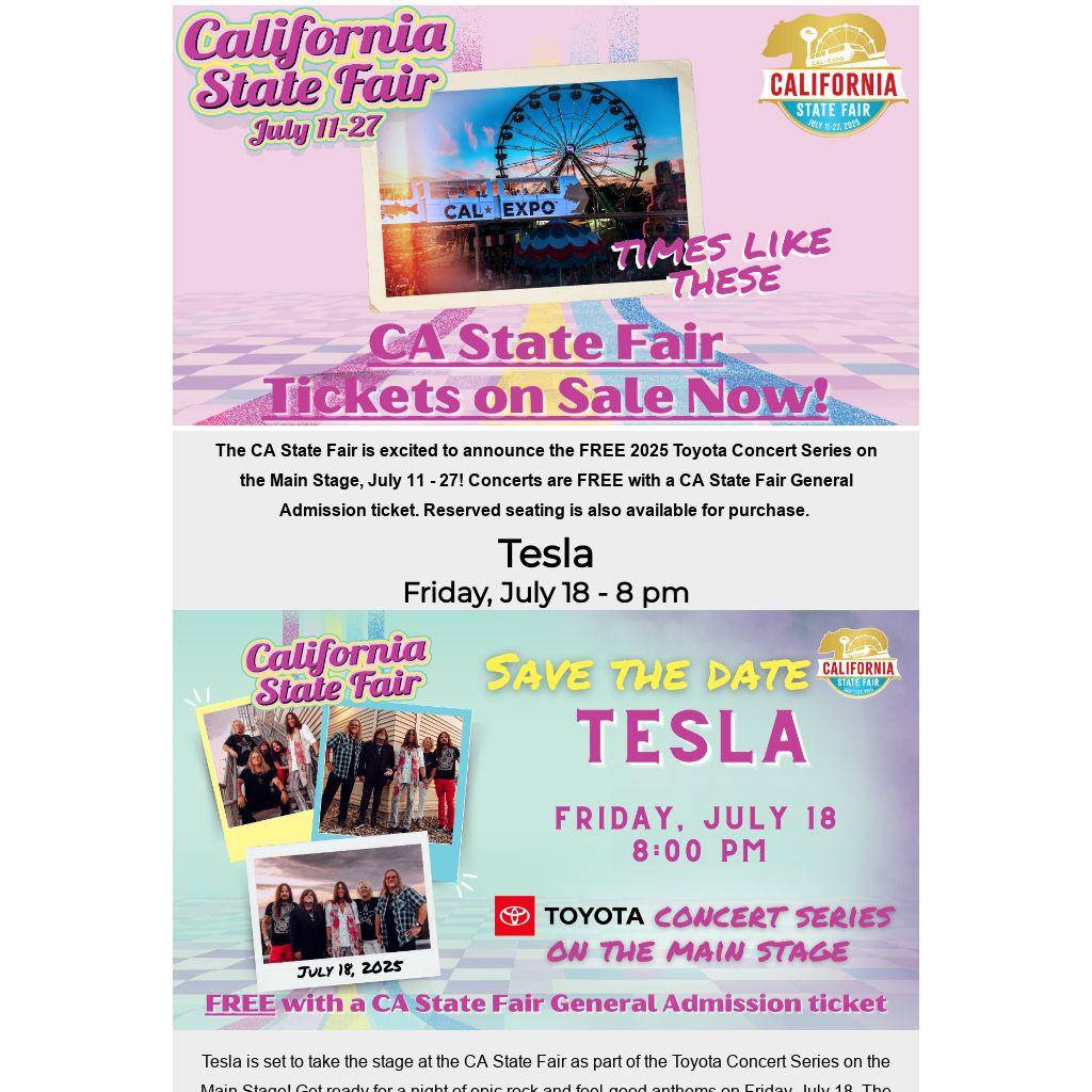 Tesla is set to take the stage at the CA State Fair as part of the Toyota Concert Series on the Main Stage! Get ready for a night of epic rock and feel-good anthems on Friday, July 18. The concert is free with General Admission. Don't miss this unforgettable event during the fair, running from July 11 to 27!