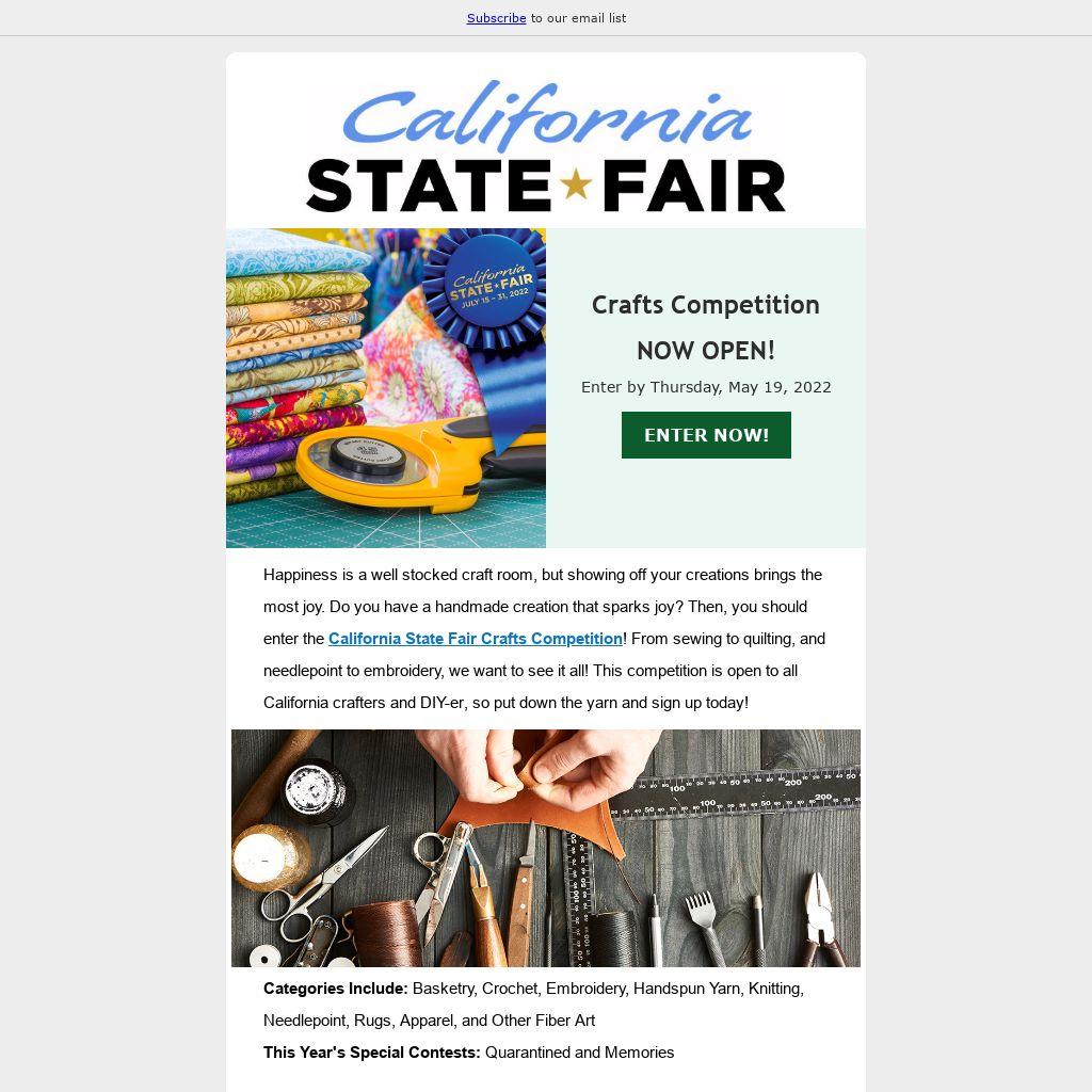 Happiness is a well stocked craft room, but showing off your creations brings the most joy. Do you have a handmade creation that sparks joy? Then, you should enter the California State Fair Crafts Competition! From sewing to quilting, and needlepoint to embroidery, we want to see it all! This competition is open to all California crafters and DIY-er, so put down the yarn and sign up today!