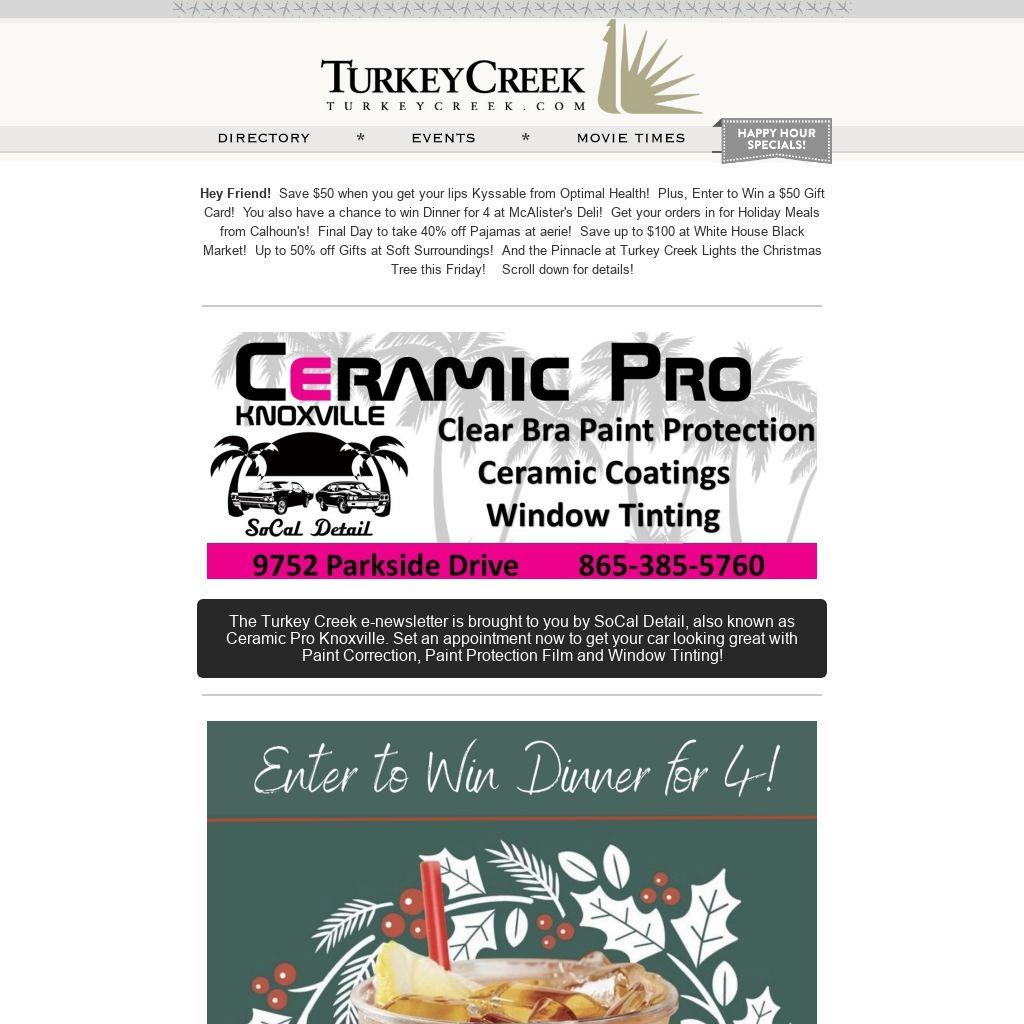 Hey Friend! Save $50 when you get your lips Kyssable from Optimal Health! Plus, Enter to Win a $50 Gift Card! You also have a chance to win Dinner for 4 at McAlister's Deli! Get your orders in for Holiday Meals from Calhoun's! Final Day to take 40% off Pajamas at aerie! Save up to $100 at White House Black Market! Up to 50% off Gifts at Soft Surroundings! And the Pinnacle at Turkey Creek Lights the Christmas Tree this Friday! Scroll down for details!
