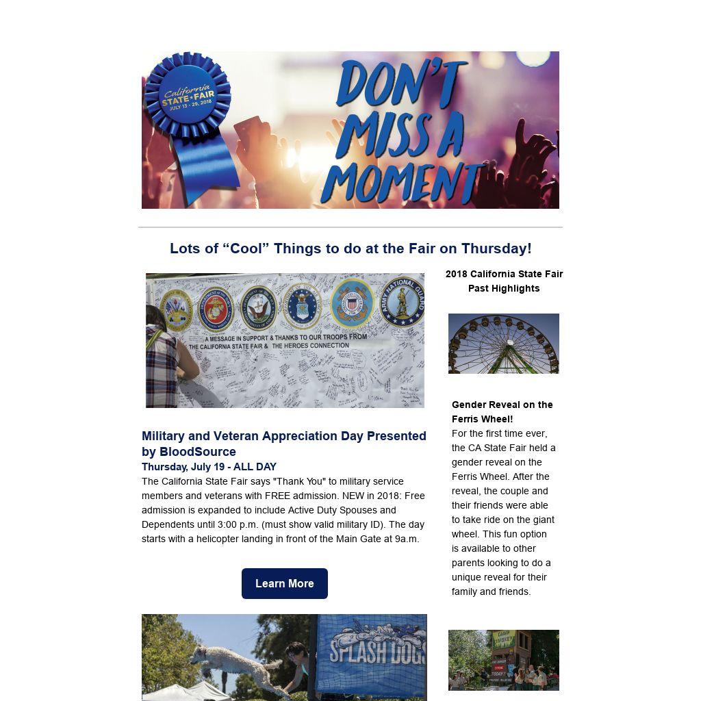 Food lovers and money savers rejoice! The $2 Taste of the Fair is back again. On Wednesdays and Thursdays from 11:00 a.m. - 4:00 p.m. every food vendor sells an item for only $2! It's the best way to try various stands at the Fair. Download the CA State Fair app for a list of what's for sale.