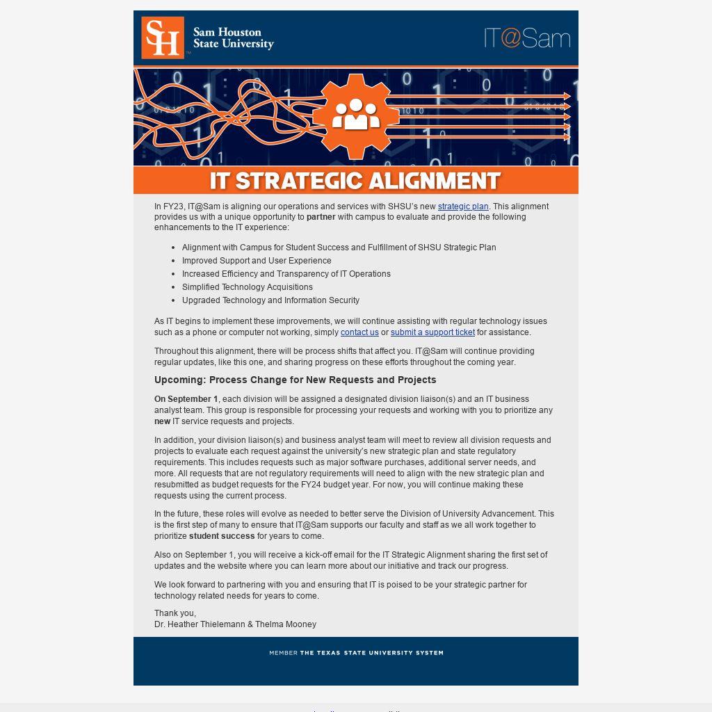 In FY23, IT@Sam is aligning our operations and services with SHSU’s new strategic plan. This alignment provides us with a unique opportunity to partner with campus to evaluate and provide the following enhancements to the IT experience: