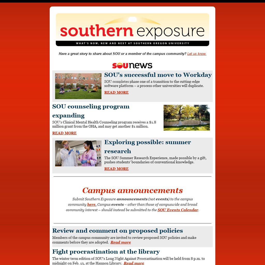 Submit Southern Exposure announcements (not events) to the campus community here. Campus events – other than those of campuswide and broad community interest – should instead be submitted to the SOU Events Calendar.