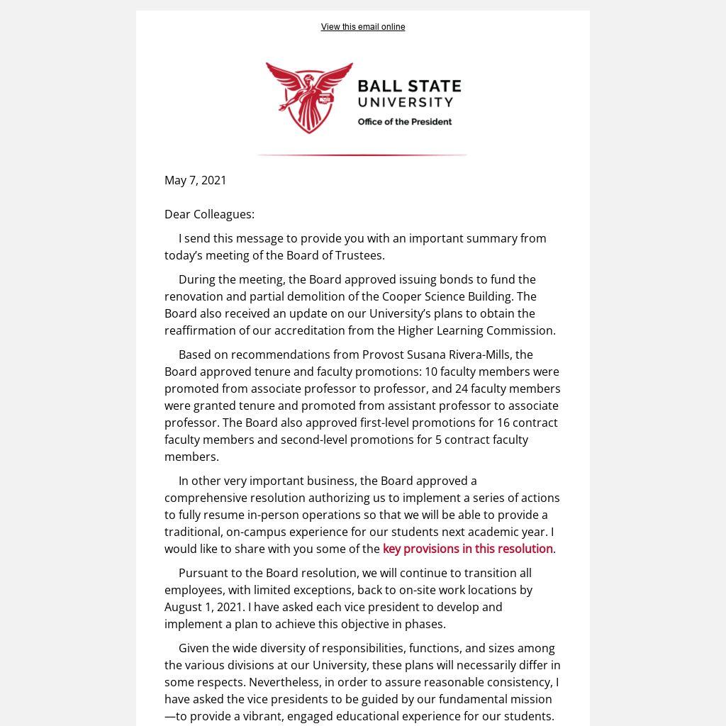In other very important business, the Board approved a comprehensive resolution authorizing us to implement a series of actions to fully resume in-person operations so that we will be able to provide a traditional, on-campus experience for our students next academic year. I would like to share with you some of the key provisions in this resolution.