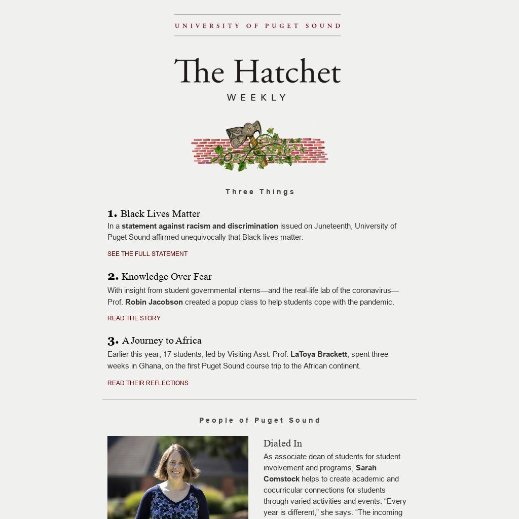 As associate dean of students for student involvement and programs, Sarah Comstock helps to create academic and cocurricular connections for students through varied activities and events. “Every year is different,” she says. “The incoming students bring new energy and ideas, and it’s incredibly cool to see how this intersects with the culture that returning students have established.” Outside of work, Sarah enjoys hiking, camping, and reading; right now, she’s working her way through Why We Can’t Sleep by Ada Calhoun.