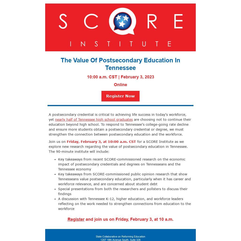 Join us on Friday, February 3, at 10:00 a.m. CST for a SCORE Institute as we explore new research regarding the value of postsecondary education in Tennessee. The 90-minute institute will include: