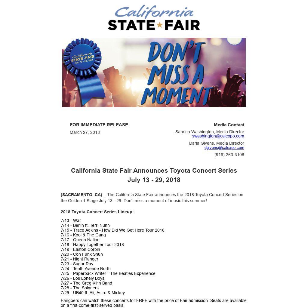 (SACRAMENTO, CA) – The California State Fair announces the 2018 Toyota Concert Series on the Golden 1 Stage July 13 - 29. Don't miss a moment of music this summer!