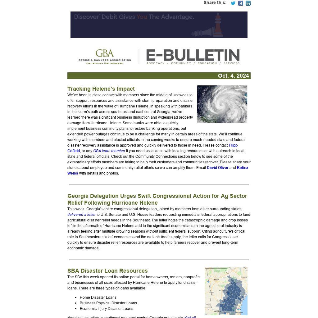 Tracking Helene’s ImpactWe’ve been in close contact with members since the middle of last week to offer support, resources and assistance with storm preparation and disaster recovery efforts in the wake of Hurricane Helene. In speaking with bankers in the storm’s path across southeast and east-central Georgia, we’ve learned there was significant business disruption and widespread property damage from Hurricane Helene. Some banks were able to quickly implement business continuity plans to restore banking operations, but extended power outages continue to be a challenge for many in certain areas of the state. We’ll continue working with members and elected officials in the coming weeks to ensure much-needed state and federal disaster recovery assistance is approved and quickly delivered to those in need. Please contact Tripp Cofield, or any GBA team member if you need assistance with locating resources or with outreach to local, state and federal officials. Check out the Community Connections section below to see some of the extraordinary efforts members are taking to help their customers and communities recover. Please share your stories about employee and community relief efforts so we can amplify them. Email David Oliver and Katina Weiss with details and photos.