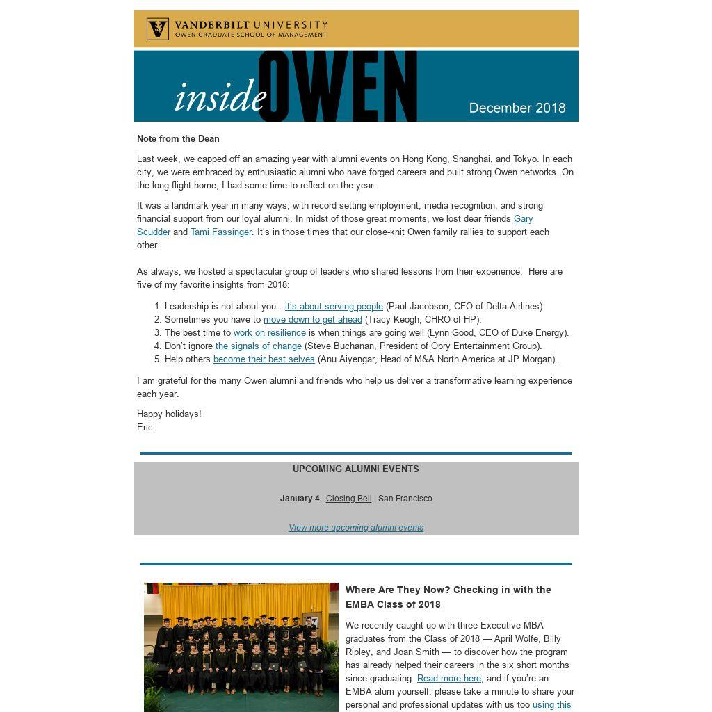 | Note from the Dean Last week, we capped off an amazing year with alumni events on Hong Kong, Shanghai, and Tokyo. In each city, we were embraced by enthusiastic alumni who have forged careers and built strong Owen networks. On the long flight home, I had some time to reflect on the year. It was a landmark year in many ways, with record setting employment, media recognition, and strong financial support from our loyal alumni. In midst of those great moments, we lost dear friends Gary Scudder and Tami Fassinger. It’s in those times that our close-knit Owen family rallies to support each other.
