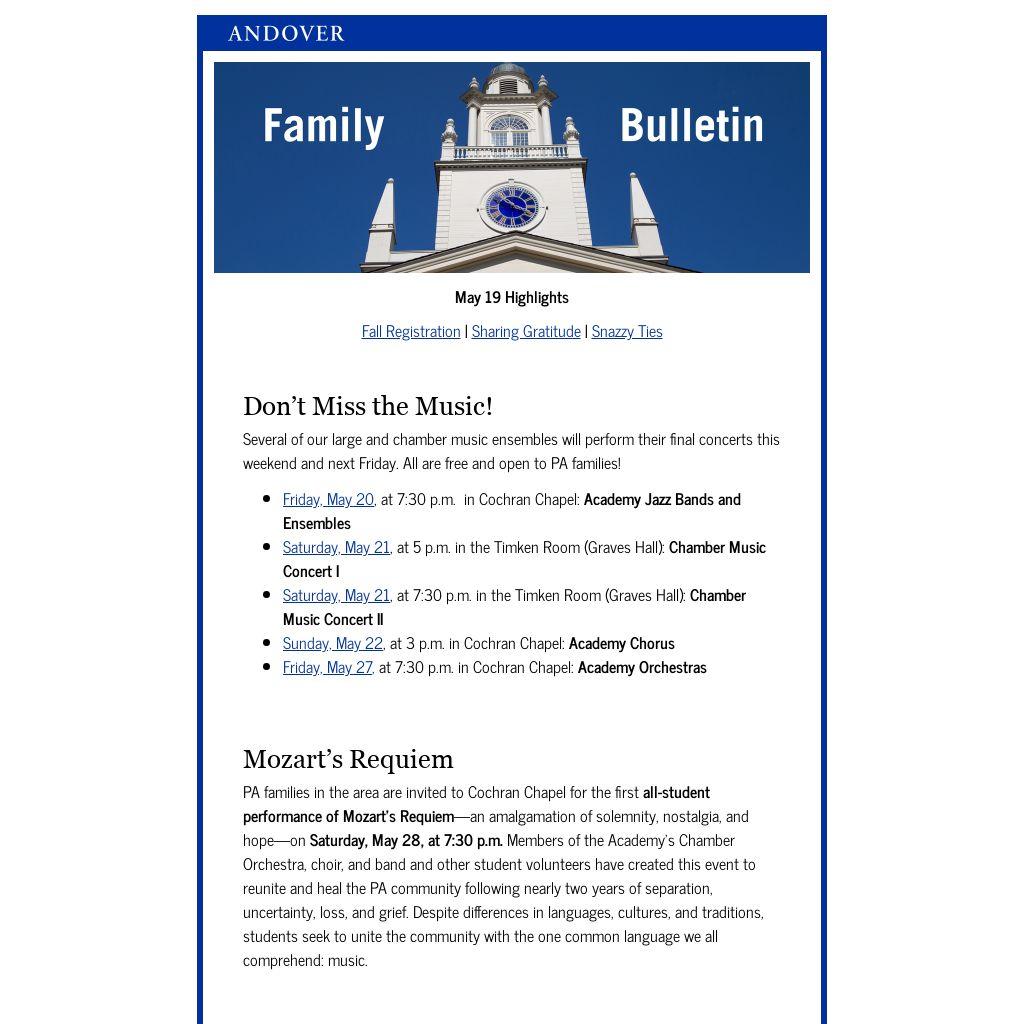 Please check the Events Calendar on Andover’s website regularly for additional in-person and online events that may be open to families. The Weekender is the Academy’s one-stop guide to weekend student activities, opportunities, club-organized events, guest speakers, performances, and athletic contests.