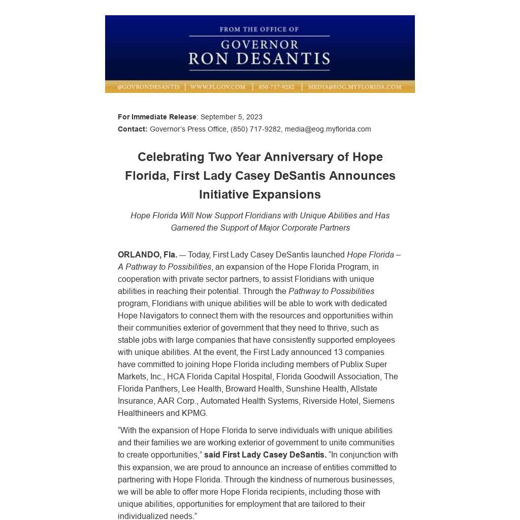 ORLANDO, Fla. — Today, First Lady Casey DeSantis launched Hope Florida – A Pathway to Possibilities, an expansion of the Hope Florida Program, in cooperation with private sector partners, to assist Floridians with unique abilities in reaching their potential. Through the Pathway to Possibilities program, Floridians with unique abilities will be able to work with dedicated Hope Navigators to connect them with the resources and opportunities within their communities exterior of government that they need to thrive, such as stable jobs with large companies that have consistently supported employees with unique abilities. At the event, the First Lady announced 13 companies have committed to joining Hope Florida including members of Publix Super Markets, Inc., HCA Florida Capital Hospital, Florida Goodwill Association, The Florida Panthers, Lee Health, Broward Health, Sunshine Health, Allstate Insurance, AAR Corp., Automated Health Systems, Riverside Hotel, Siemens Healthineers and KPMG.