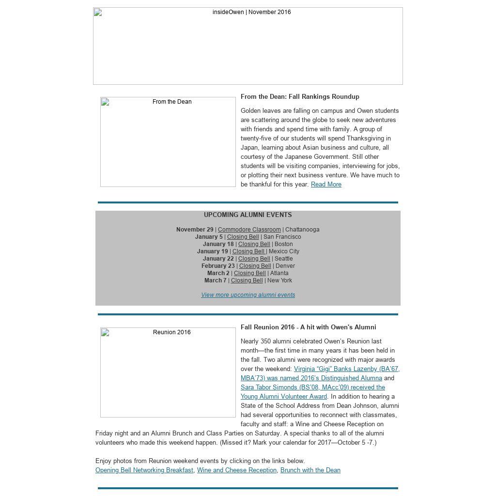 Golden leaves are falling on campus and Owen students are scattering around the globe to seek new adventures with friends and spend time with family. A group of twenty-five of our students will spend Thanksgiving in Japan, learning about Asian business and culture, all courtesy of the Japanese Government. Still other students will be visiting companies, interviewing for jobs, or plotting their next business venture. We have much to be thankful for this year. Read More