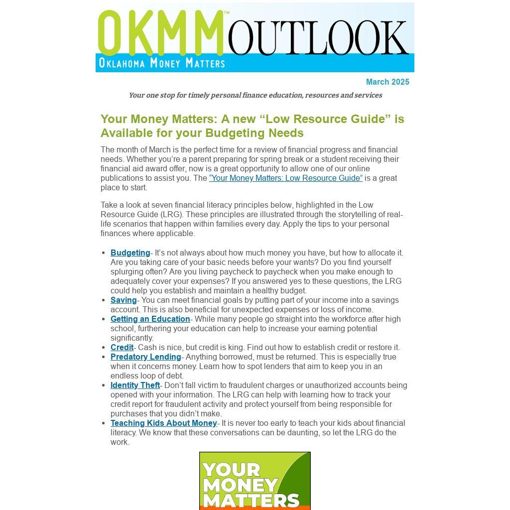 The month of March is the perfect time for a review of financial progress and financial needs. Whether you’re a parent preparing for spring break or a student receiving their financial aid award offer, now is a great opportunity to allow one of our online publications to assist you. The “Your Money Matters: Low Resource Guide” is a great place to start.