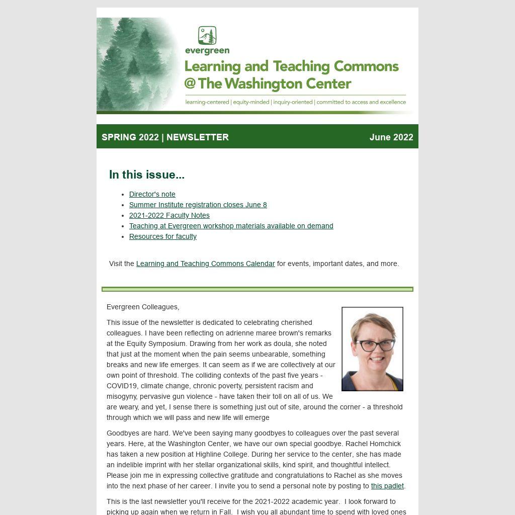 Goodbyes are hard. We've been saying many goodbyes to colleagues over the past several years. Here, at the Washington Center, we have our own special goodbye. Rachel Homchick has taken a new position at Highline College. During her service to the center, she has made an indelible imprint with her stellar organizational skills, kind spirit, and thoughtful intellect. Please join me in expressing collective gratitude and congratulations to Rachel as she moves into the next phase of her career. I invite you to send a personal note by posting to