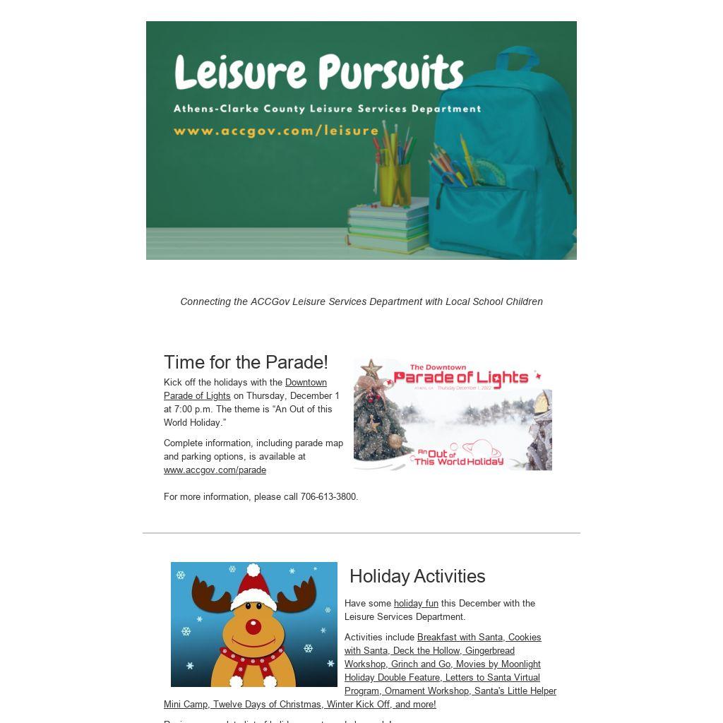 ACCGov Activities and Online RegistrationThe Athens-Clarke County Leisure Services Department offers a diverse selection of activities highlighting the arts, environmental science, recreation, sports, and holiday events for adults and children. All registration takes place online at www.accgov.com/myrec