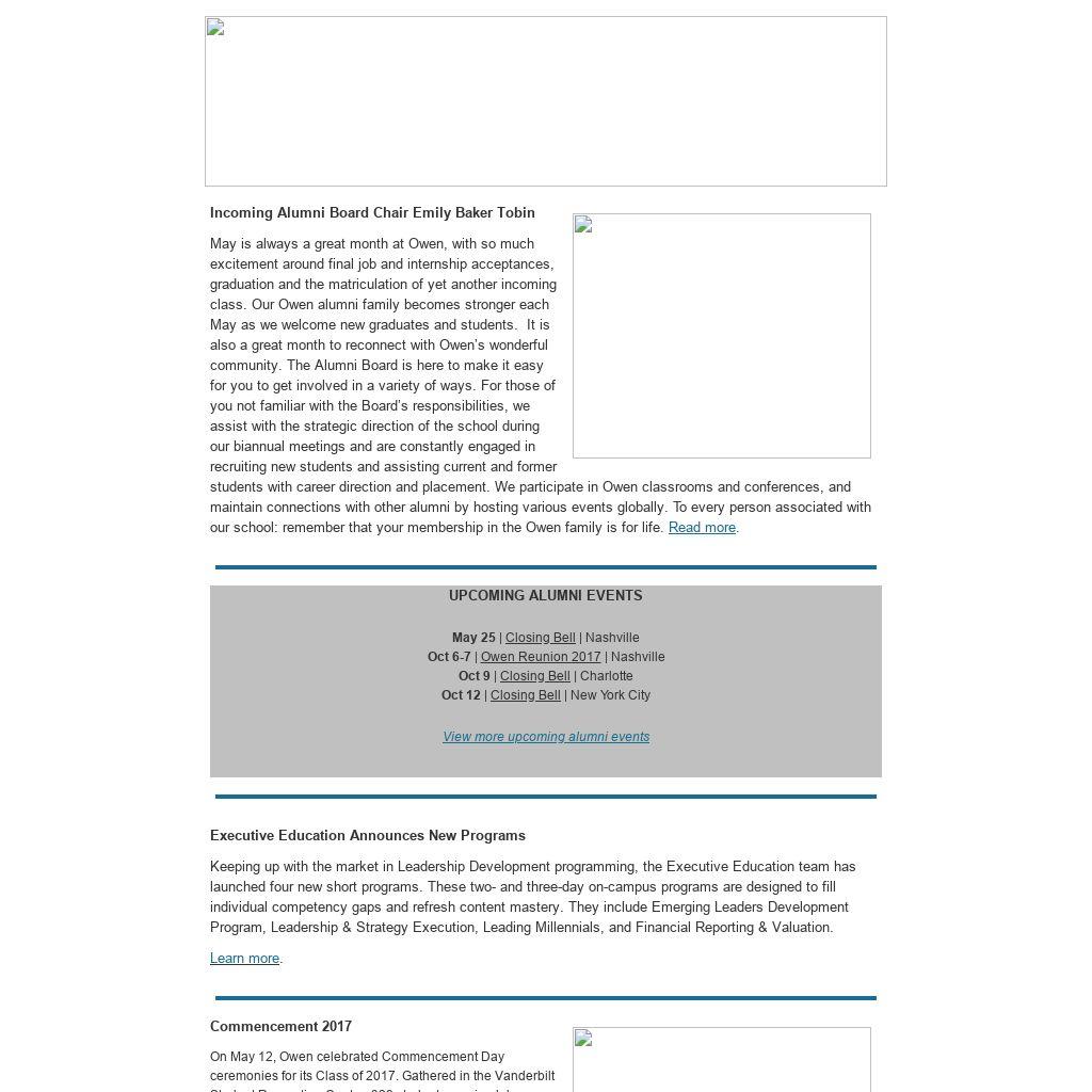 | Incoming Alumni Board Chair Emily Baker Tobin May is always a great month at Owen, with so much excitement around final job and internship acceptances, graduation and the matriculation of yet another incoming class. Our Owen alumni family becomes stronger each May as we welcome new graduates and students. It is also a great month to reconnect with Owen’s wonderful community. The Alumni Board is here to make it easy for you to get involved in a variety of ways. For those of you not familiar with the Board’s responsibilities, we assist with the strategic direction of the school during our biannual meetings and are constantly engaged in recruiting new students and assisting current and former students with career direction and placement. We participate in Owen classrooms and conferences, and maintain connections with other alumni by hosting various events globally. To every person associated with our school: remember that your membership in the Owen family is for life. Read more.
