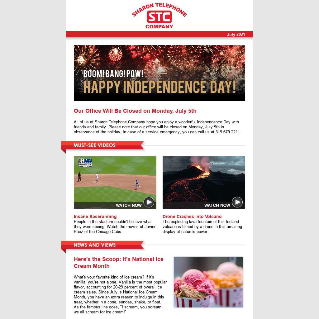 Our Office Will Be Closed on Monday, July 5th All of us at Sharon Telephone Company hope you enjoy a wonderful Independence Day with friends and family. Please note that our office will be closed on Monday, July 5th in observance of the holiday. In case of a service emergency, you can call us at 319.679.2211. |