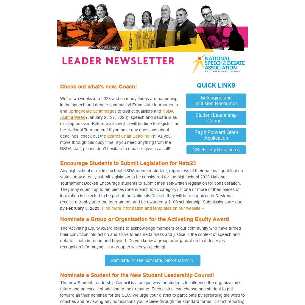 We're two weeks into 2023 and so many things are happening in the speech and debate community! From state tournaments and Springboard Scrimmages to district qualifiers and NSDA Alumni Week (January 23-27, 2023), speech and debate is as exciting as ever. Before we know it, it will be time to register for the National Tournament! If you have any questions about deadlines, check out the District Chair Deadline list. As you move through this busy time, if you need anything from the NSDA staff, please don't hesitate to email or give us a call!