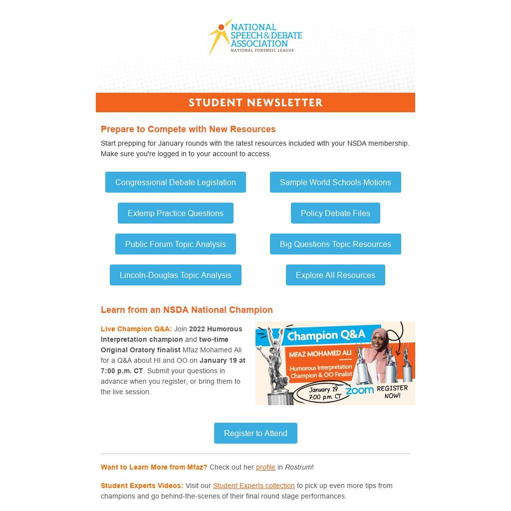 Live Champion Q&A: Join 2022 Humorous Interpretation champion and two-time Original Oratory finalist Mfaz Mohamed Ali for a Q&A about HI and OO on January 19 at 7:00 p.m. CT. Submit your questions in advance when you register, or bring them to the live session.