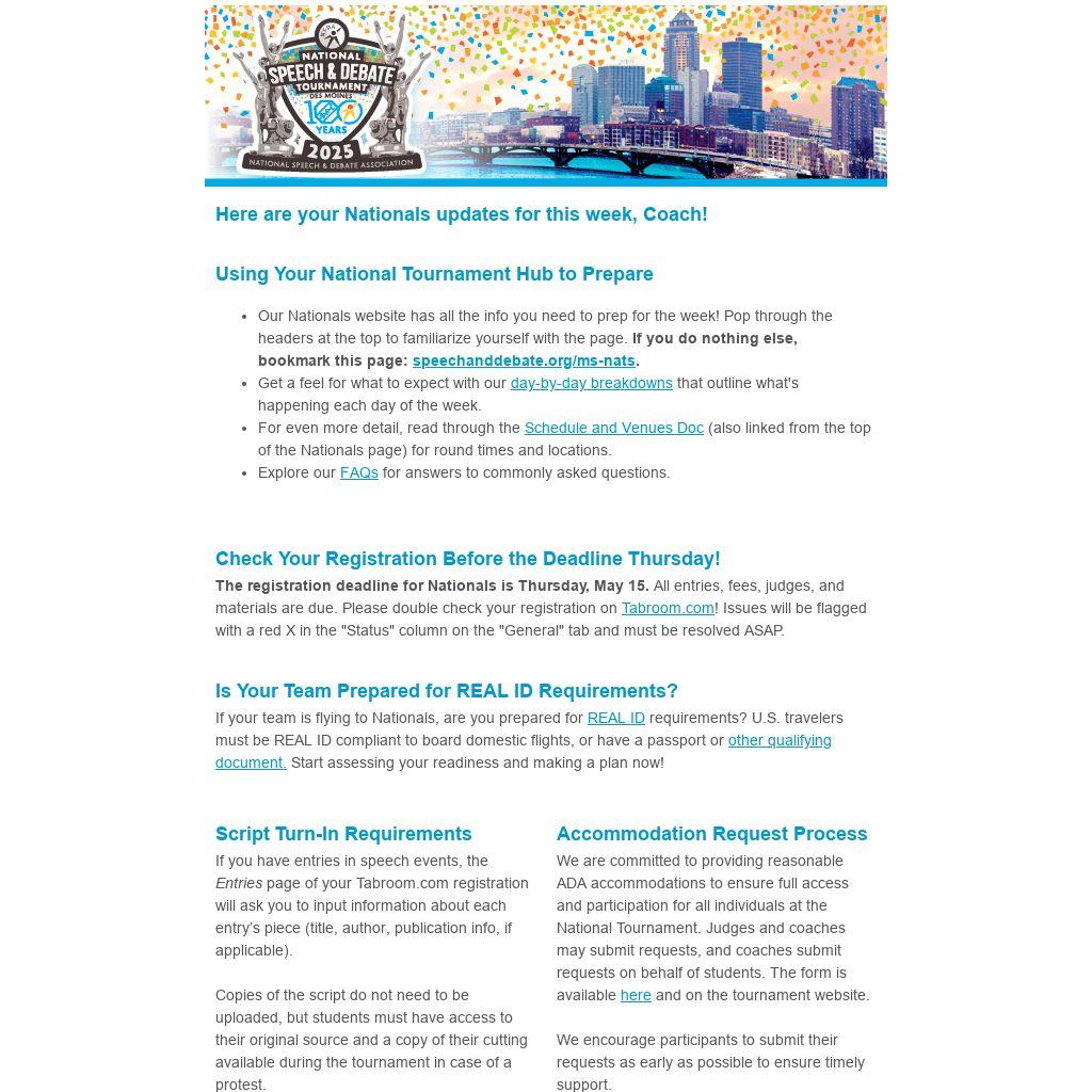 Our Nationals website has all the info you need to prep for the week! Pop through the headers at the top to familiarize yourself with the page. If you do nothing else, bookmark this page: speechanddebate.org/ms-nats.