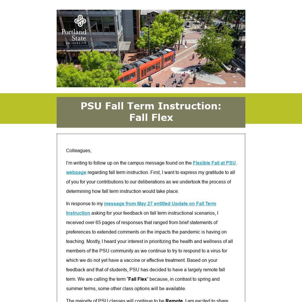 I’m writing to follow up on the campus message found on the Flexible Fall at PSU webpage regarding fall term instruction. First, I want to express my gratitude to all of you for your contributions to our deliberations as we undertook the process of determining how fall term instruction would take place.