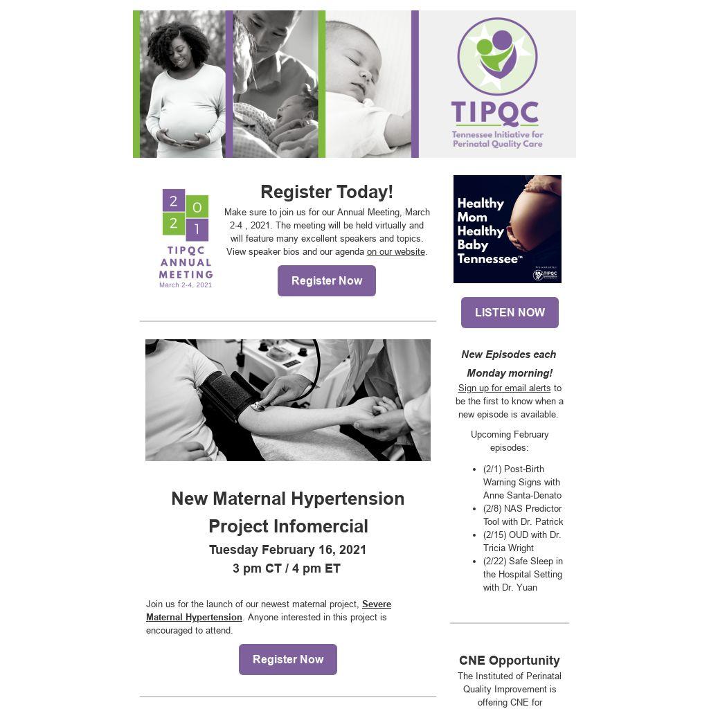 TIPQC is excited to offer the opportunity for TN hospitals and other TN maternal outpatient clinics, doulas, and midwifes to receive the AWHONN POST-BIRTH Warning signs training* for nursing staff who will educate patients on warning signs and when to seek immediate medical attention thus saving lives. TIPQC will pay for this training for 10 nurses by Dec 2021 through a grant from ACOG AIM and TDH MMR, to implement the tool kit and POST-BIRTH patient education in discharge planning.