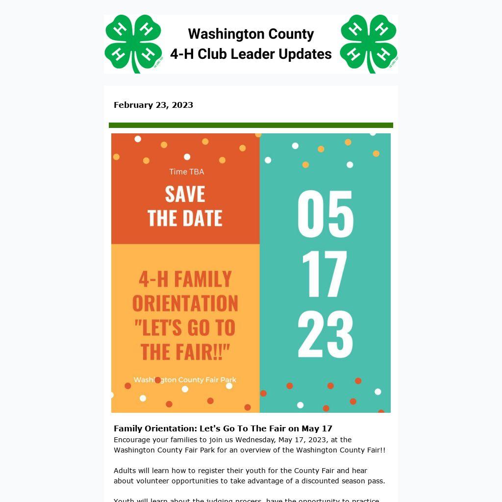 Encourage your families to join us Wednesday, May 17, 2023, at the Washington County Fair Park for an overview of the Washington County Fair!!