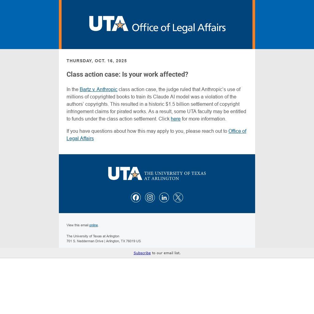 In the Bartz v. Anthropic class action case, the judge ruled that Anthropic’s use of millions of copyrighted books to train its Claude AI model was a violation of the authors’ copyrights. This resulted in a historic $1.5 billion settlement of copyright infringement claims for pirated works. As a result, some UTA faculty may be entitled to funds under the class action settlement. Click here for more information.