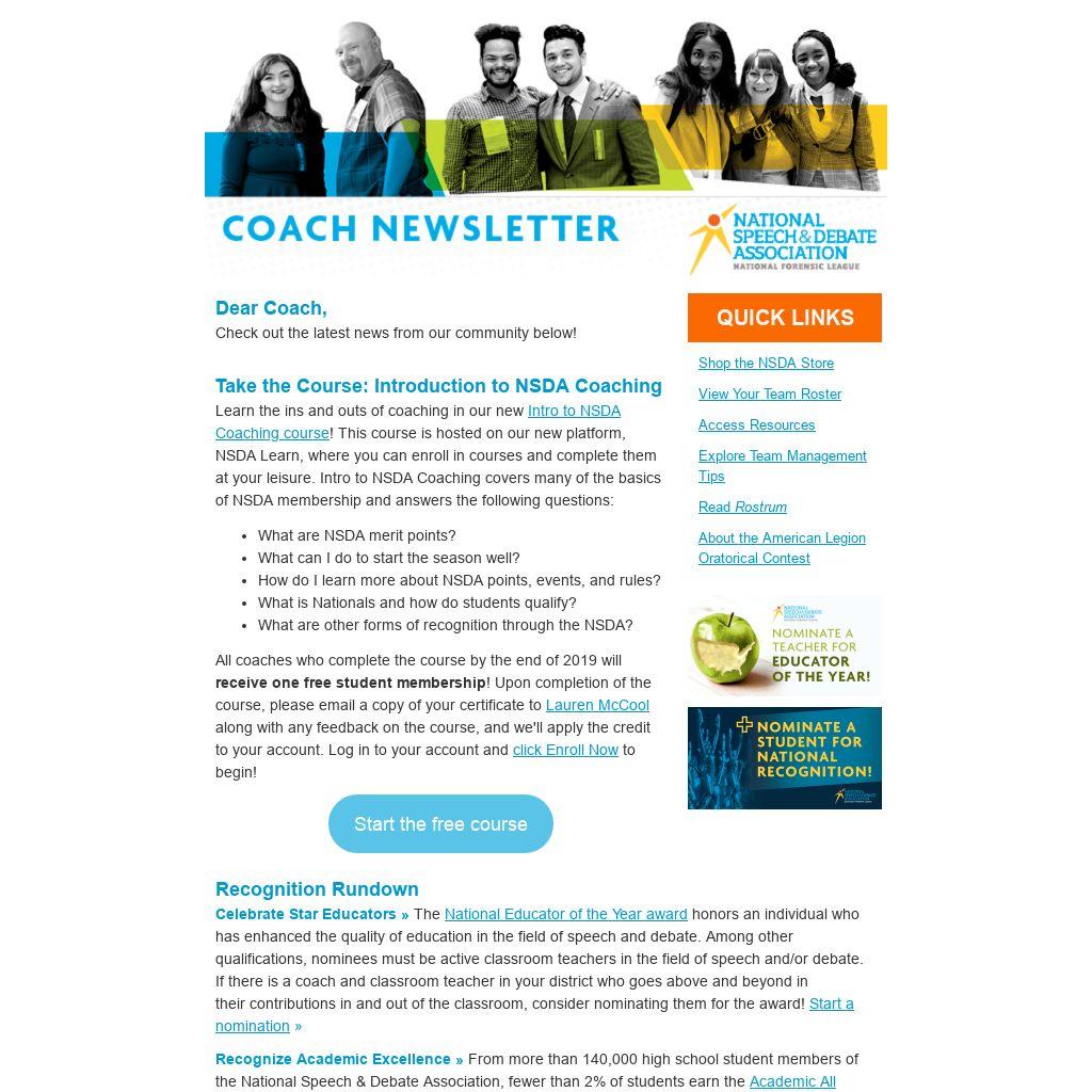 Take the Course: Introduction to NSDA CoachingLearn the ins and outs of coaching in our new Intro to NSDA Coaching course! This course is hosted on our new platform, NSDA Learn, where you can enroll in courses and complete them at your leisure. Intro to NSDA Coaching covers many of the basics of NSDA membership and answers the following questions: