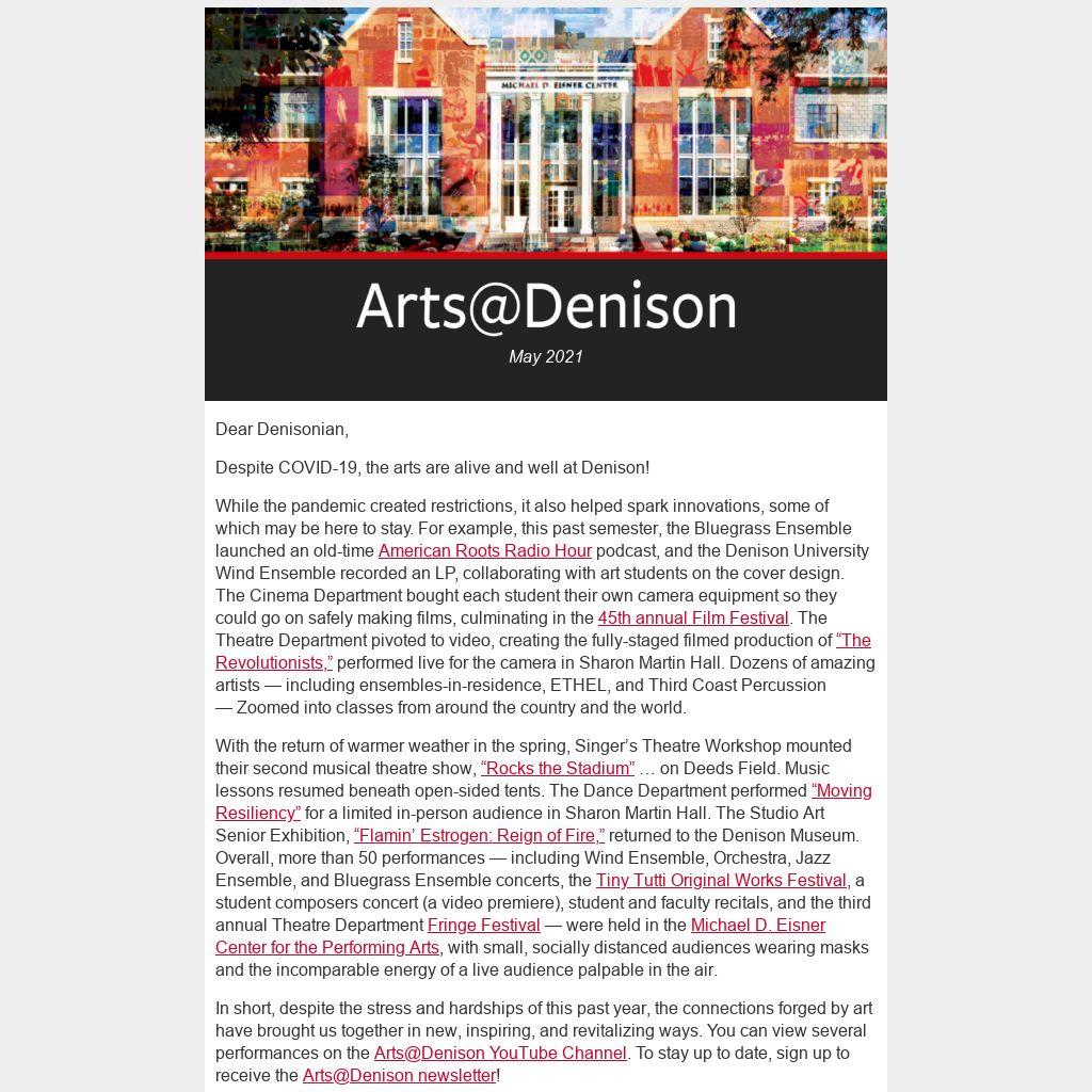 Dear Denisonian,Despite COVID-19, the arts are alive and well at Denison!While the pandemic created restrictions, it also helped spark innovations, some of which may be here to stay. For example, this past semester, the Bluegrass Ensemble launched an old-time American Roots Radio Hour podcast, and the Denison University Wind Ensemble recorded an LP, collaborating with art students on the cover design. The Cinema Department bought each student their own camera equipment so they could go on safely making films, culminating in the 45th annual Film Festival. The Theatre Department pivoted to video, creating the fully-staged filmed production of “The Revolutionists,” performed live for the camera in Sharon Martin Hall. Dozens of amazing artists — including ensembles-in-residence, ETHEL, and Third Coast Percussion — Zoomed into classes from around the country and the world.With the return of warmer weather in the spring, Singer’s Theatre Workshop mounted their second musical theatre show, “Rocks the Stadium” … on Deeds Field. Music lessons resumed beneath open-sided tents. The Dance Department performed “Moving Resiliency” for a limited in-person audience in Sharon Martin Hall. The Studio Art Senior Exhibition, “Flamin’ Estrogen: Reign of Fire,” returned to the Denison Museum. Overall, more than 50 performances — including Wind Ensemble, Orchestra, Jazz Ensemble, and Bluegrass Ensemble concerts, the Tiny Tutti Original Works Festival, a student composers concert (a video premiere), student and faculty recitals, and the third annual Theatre Department Fringe Festival — were held in the Michael D. Eisner Center for the Performing Arts, with small, socially distanced audiences wearing masks and the incomparable energy of a live audience palpable in the air.In short, despite the stress and hardships of this past year, the connections forged by art have brought us together in new, inspiring, and revitalizing ways. You can view several performances on the Arts@Denison YouTube Channel. To stay up to date, sign up to receive the Arts@Denison newsletter!