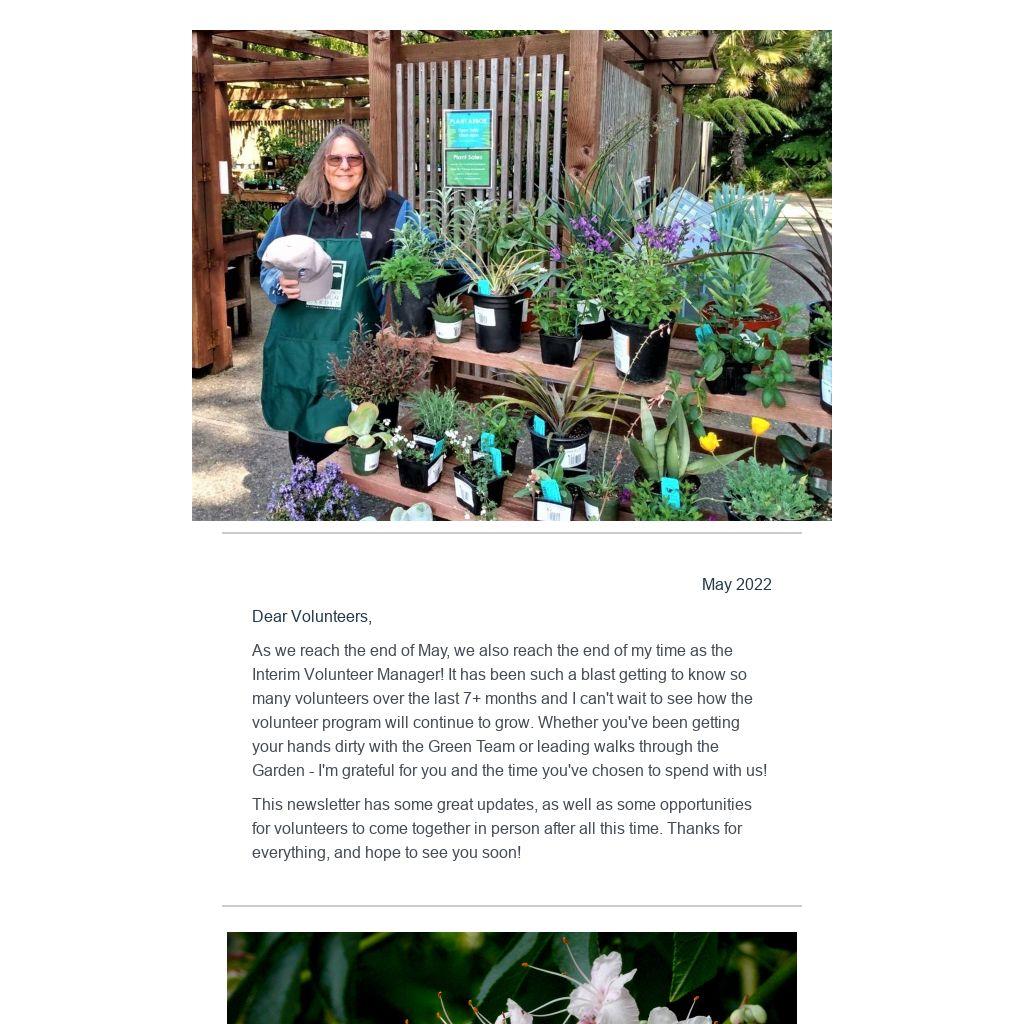 As we reach the end of May, we also reach the end of my time as the Interim Volunteer Manager! It has been such a blast getting to know so many volunteers over the last 7+ months and I can't wait to see how the volunteer program will continue to grow. Whether you've been getting your hands dirty with the Green Team or leading walks through the Garden - I'm grateful for you and the time you've chosen to spend with us!