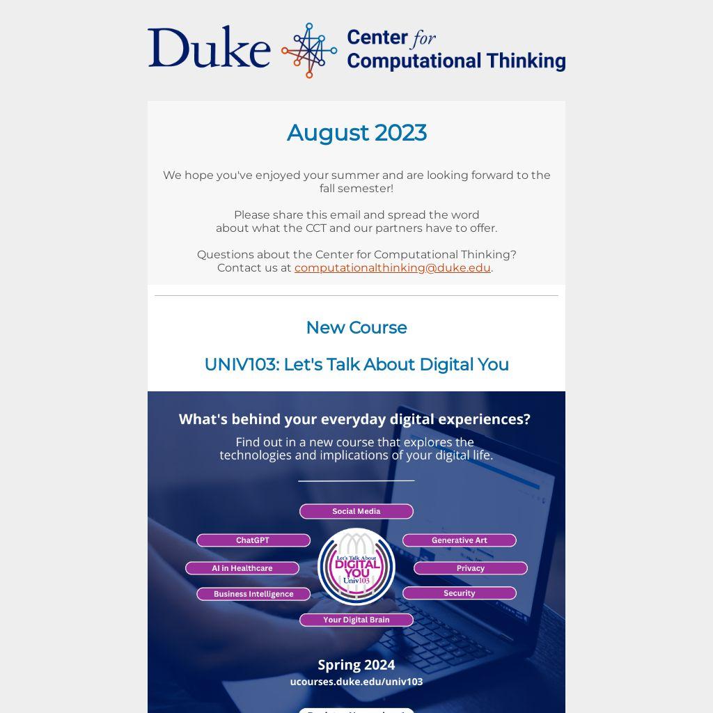 You're receiving this email because you participated in a Duke +DataScience learning experience or have expressed interest in the CCT.