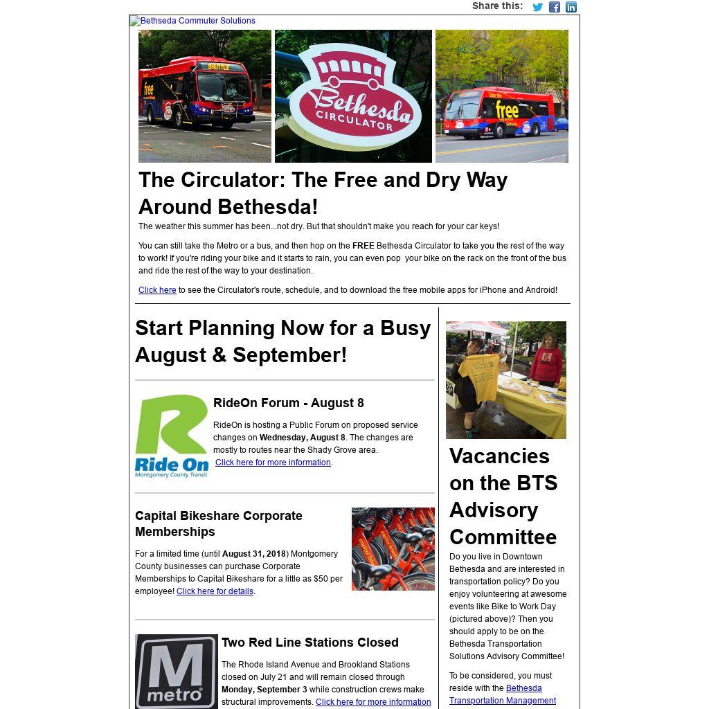 You can still take the Metro or a bus, and then hop on the FREE Bethesda Circulator to take you the rest of the way to work! If you're riding your bike and it starts to rain, you can even pop your bike on the rack on the front of the bus and ride the rest of the way to your destination.