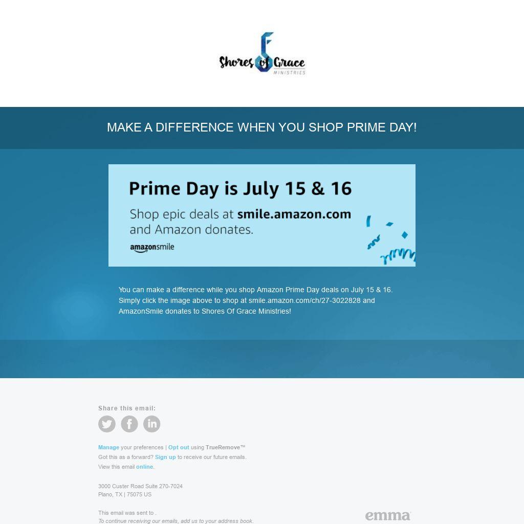 You can make a difference while you shop Amazon Prime Day deals on July 15 & 16. Simply click the image above to shop at smile.amazon.com/ch/27-3022828 and AmazonSmile donates to Shores Of Grace Ministries!