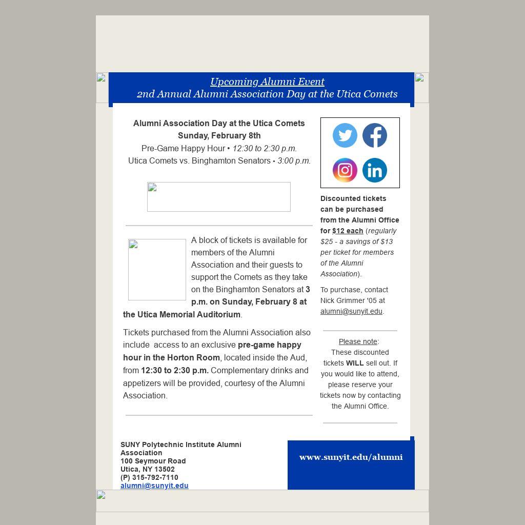 A block of tickets is available for members of the Alumni Association and their guests to support the Comets as they take on the Binghamton Senators at 3 p.m. on Sunday, February 8 at the Utica Memorial Auditorium.
