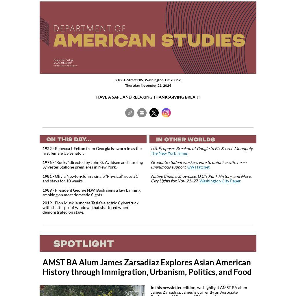 In this newsletter edition, we highlight AMST BA alum James Zarsadiaz. James is currently an Associate Professor of History and Director of the Yuchengco Philippine Studies Program at the University of San Francisco. He credits his time at GW with deepening his passion for American culture, particularly around immigration, urbanism, and the influences of U.S. domestic and foreign policy. After receiving his B.A. in American Studies and Political Science from GW, he pursued his M.A. and Ph.D. in History from Northwestern University, completing his studies in 2014 and joining the USF faculty that fall.