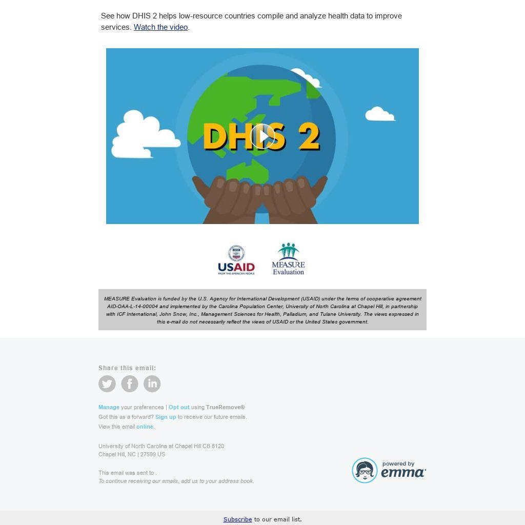 MEASURE Evaluation is funded by the U.S. Agency for International Development (USAID) under the terms of cooperative agreement AID-OAA-L-14-00004 and implemented by the Carolina Population Center, University of North Carolina at Chapel Hill, in partnership with ICF International, John Snow, Inc., Management Sciences for Health, Palladium, and Tulane University. The views expressed in this e-mail do not necessarily reflect the views of USAID or the United States government.