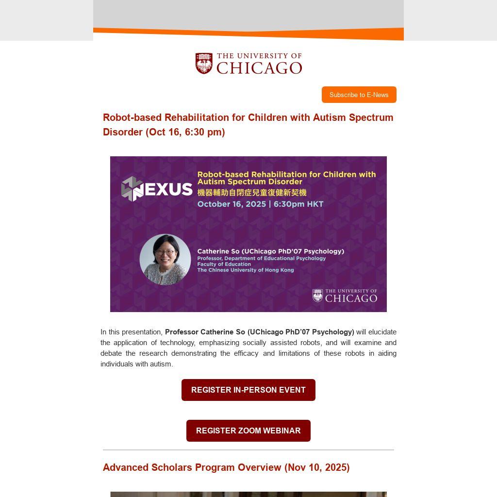 In this presentation, Professor Catherine So (UChicago PhD’07 Psychology) will elucidate the application of technology, emphasizing socially assisted robots, and will examine and debate the research demonstrating the efficacy and limitations of these robots in aiding individuals with autism.