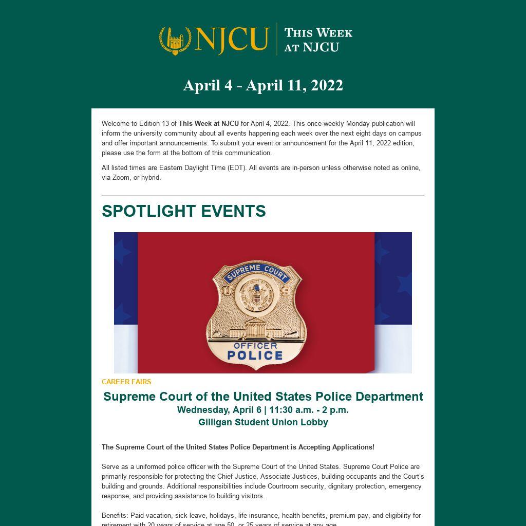 Welcome to Edition 13 of This Week at NJCU for April 4, 2022. This once-weekly Monday publication will inform the university community about all events happening each week over the next eight days on campus and offer important announcements. To submit your event or announcement for the April 11, 2022 edition, please use the form at the bottom of this communication.