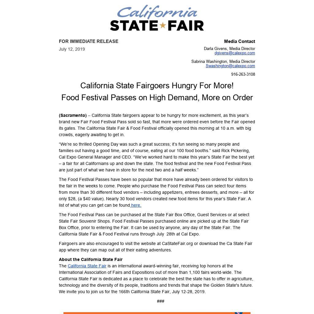 The Food Festival Pass can be purchased at the State Fair Box Office, Guest Services or at select State Fair Souvenir Shops. Food Festival Passes purchased online are picked up at the State Fair Box Office, prior to entering the Fair. It can be used by anyone, any day of the State Fair. The California State Fair & Food Festival runs through July 28th at Cal Expo.