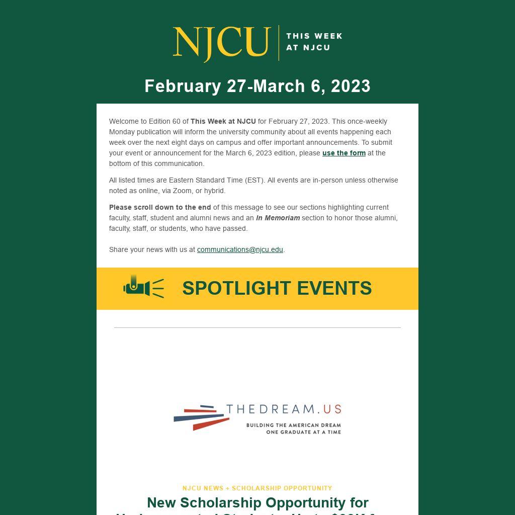 Welcome to Edition 60 of This Week at NJCU for February 27, 2023. This once-weekly Monday publication will inform the university community about all events happening each week over the next eight days on campus and offer important announcements. To submit your event or announcement for the March 6, 2023 edition, please use the form at the bottom of this communication.