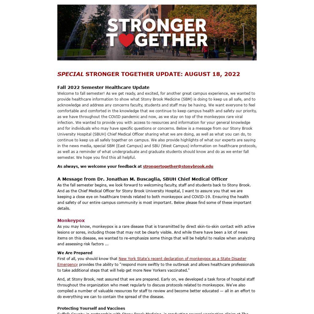 Welcome to fall semester! As we get ready, and excited, for another great campus experience, we wanted to provide healthcare information to show what Stony Brook Medicine (SBM) is doing to keep us all safe, and to acknowledge and address any concerns faculty, students and staff may be having. We want everyone to feel comfortable and comforted in the knowledge that we continue to keep campus health and safety our priority, as we have throughout the COVID pandemic and now, as we stay on top of the monkeypox rare viral infection. We wanted to provide you with access to resources and information for your general knowledge and for individuals who may have specific questions or concerns. Below is a message from our Stony Brook University Hospital (SBUH) Chief Medical Officer sharing what we are doing, as well as what you can do, to continue to keep us all safely together on campus. We also provide highlights of what our experts are saying in the news media, special SBM (East Campus) and SBU (West Campus) information on healthcare protocols, as well as a reminder of what undergraduate and graduate students should know and do as we enter fall semester. We hope you find this all helpful.