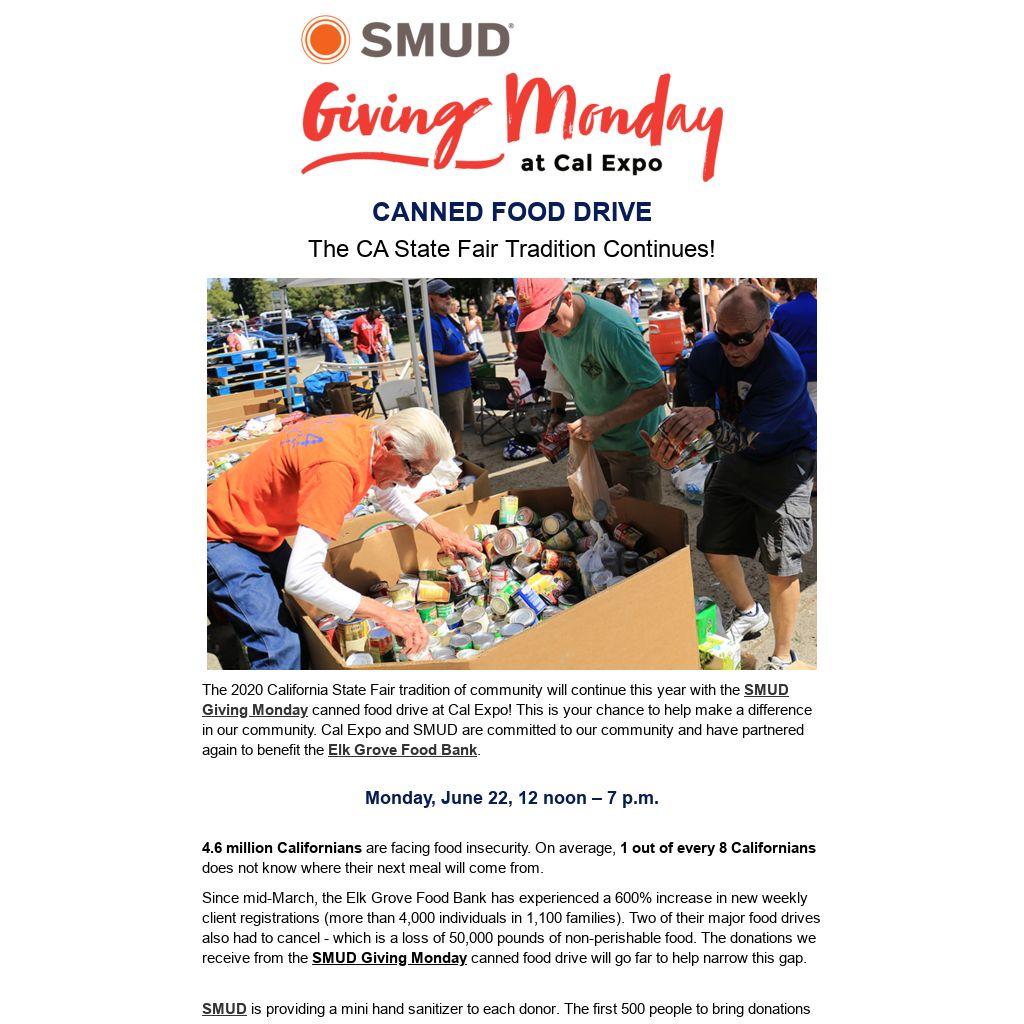 The 2020 California State Fair tradition of community will continue this year with the SMUD Giving Monday canned food drive at Cal Expo! This is your chance to help make a difference in our community. Cal Expo and SMUD are committed to our community and have partnered again to benefit the Elk Grove Food Bank.