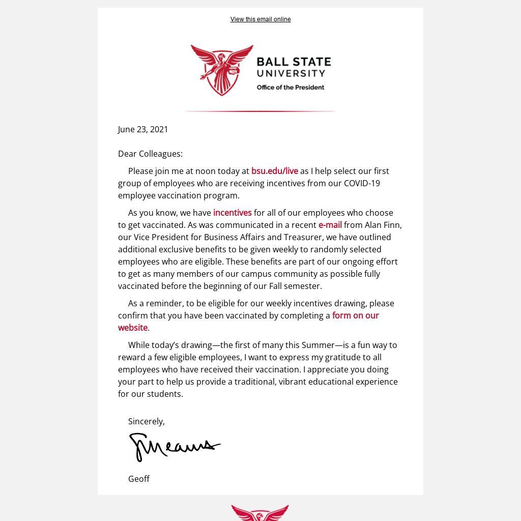 Please join me at noon today at bsu.edu/live as I help select our first group of employees who are receiving incentives from our COVID-19 employee vaccination program.