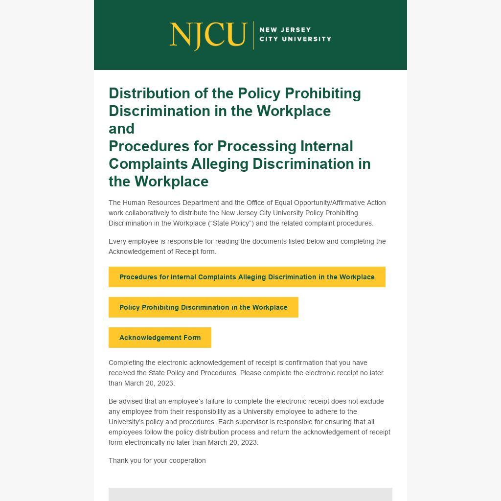 Be advised that an employee’s failure to complete the electronic receipt does not exclude any employee from their responsibility as a University employee to adhere to the University’s policy and procedures. Each supervisor is responsible for ensuring that all employees follow the policy distribution process and return the acknowledgement of receipt form electronically no later than March 20, 2023.