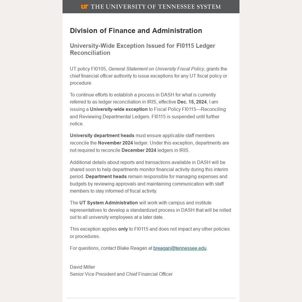 To continue efforts to establish a process in DASH for what is currently referred to as ledger reconciliation in IRIS, effective Dec. 15, 2024, I am issuing a University-wide exception to Fiscal Policy FI0115—Reconciling and Reviewing Departmental Ledgers. FI0115 is suspended until further notice.