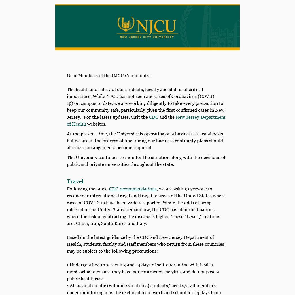 The health and safety of our students, faculty and staff is of critical importance. While NJCU has not seen any cases of Coronavirus (COVID-19) on campus to date, we are working diligently to take every precaution to keep our community safe, particularly given the first confirmed cases in New Jersey. For the latest updates, visit the