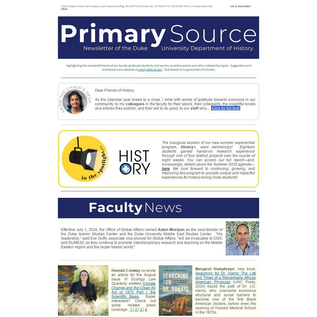 The next issue of Primary Source is scheduled for May 2025. Please submit all news items to history@duke.edu by June 1. Happy holidays & New Year!