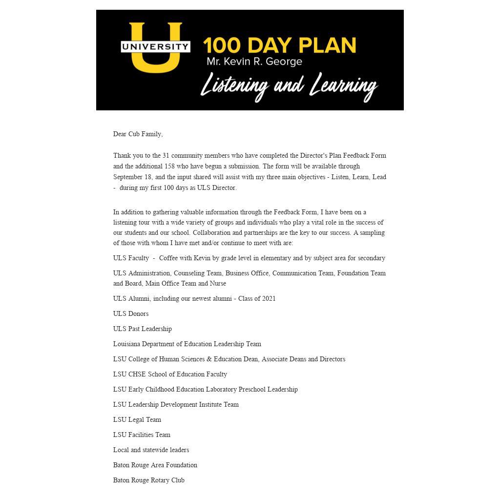 Also, for your convenience, links to my 100-Day Plan and Feedback Form are included at the end of this email. I encourage you to share your thoughts and ideas with me.