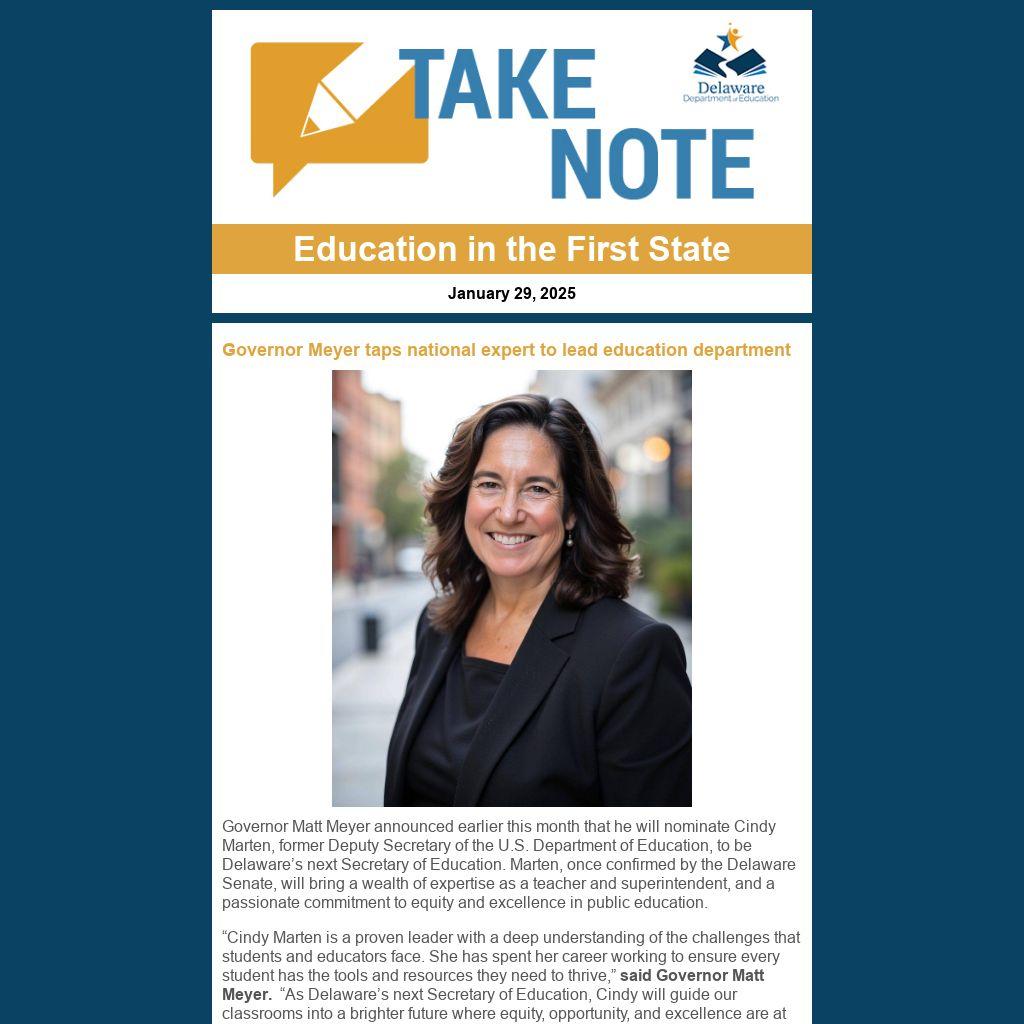 “I am honored to join Governor-elect Meyer’s team and help lead Delaware’s public schools into a new era,” said former Deputy Secretary Cindy Marten. “I believe deeply in the power of education to change lives, and I am committed to working with teachers, parents, students, and communities to ensure all of Delaware’s children receive a world-class education.”